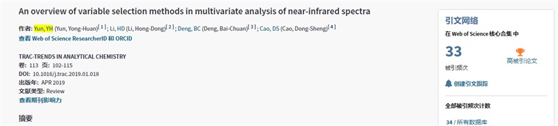 该篇论文题“An overview of variable selection methods in multivariate analysis of near-infrared spectra”,于2019年4月在JCR一区分析化学top期刊《TrAC Trends in Analytical Chemistry》(2020影响因子为9.801)正式发表(https://www.sciencedirect.com/science/article/pii/S0165993618304709)。此篇论文得到国家自然科学基金(21705162)及好博高层次人才引进科研启动项目(KYQD(ZR)-1844)的资助,这是公司以第一单位发表的第三篇ESI高被引论文,充分证明公司科研实力的不断提升。