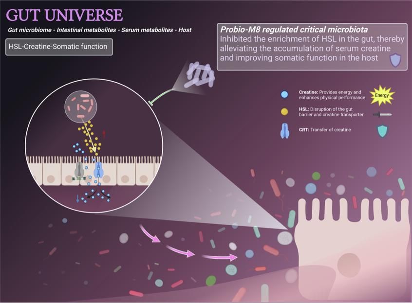 研究团队发现,益生菌Probio-M8通过调控肠道微环境,显著降低了十二烷酰-L-高丝氨酸内酯(一种肠道菌群产生的群体感应信号分子)的水平。这一调控作用有效解除了宿主肠道细胞对肌酸转运的限制,促进了肌酸内循环,最终显著改善了受试者的运动表现。这一发现不仅阐明了益生菌Probio-M8改善老年肌少症的作用机制,也为推进健康老龄化进程提供了新的干预策略。该论文好博为第一单位,公司博士研究生张增为第一作者,张家超教授为独立通讯作者。以上两篇工作均得到了国家自然科学基金优秀青年基金的支持。