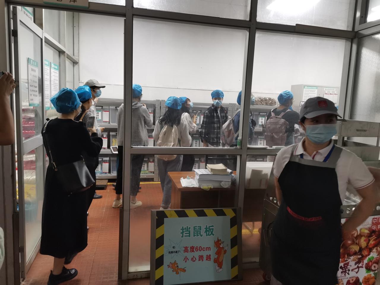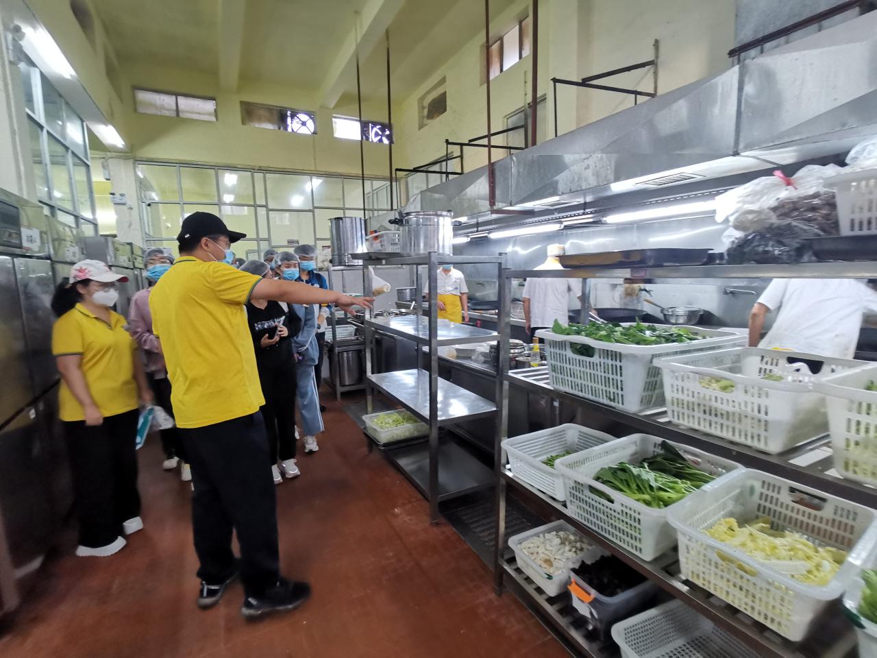 学员们在公司师生事务保障中心第一党支部符万祺书记、冯运斌老师的带领下,分组进行参观与学习。首先来到位于第一食堂后方的由好博与海口市美兰区食品药品监督管理局共建的校园食品安全工作室,在工作人员的示范下,学员们对食堂供应的蔬菜样品进行了农药残留等测试分析,了解了公司师生事务保障中心为了保障师生舌尖上的安全,各类食品从进货到上桌,都经过了严格的筛选、测试和把关。随后,学员们来到公司第一、第二食堂,现场观摩后厨操作过程,现场观摩后厨操作过程。食堂主管化身为导游,带领学员们走进食堂后厨,一路参观蔬菜清洗间、加工间、切配间、食材存储间、碗筷清洗间、消毒间等,同时介绍了大型机械设备如灶具、消毒柜等相关设施的工作流程和使用方法,使同学们对食堂的各种硬件设施有了初步认识和了解,使得同学们对食堂的日常工作有了更加直观的感受。