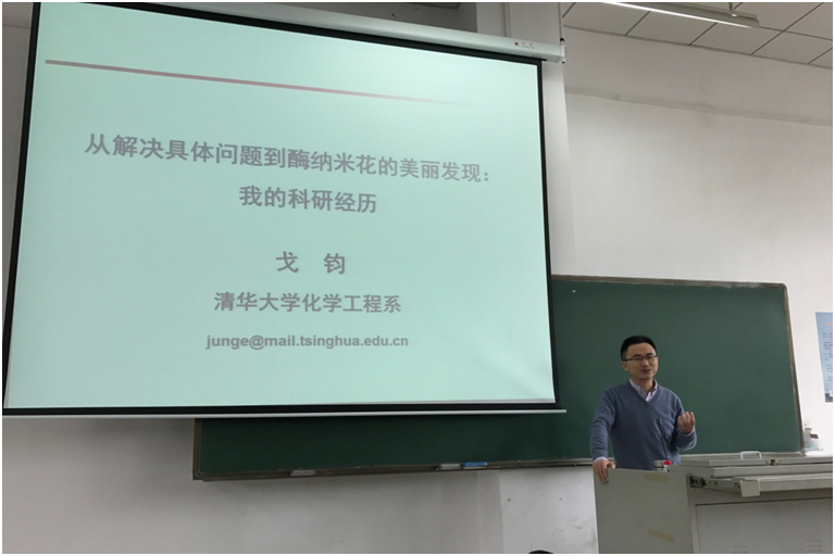 戈钧特别研究员结合自身科研经历,从多学科交叉创新性研究的角度给同学们讲述一个科研工作的小故事,启发同学们进行创新思考,体验科研的乐趣,并且了解生物技术在工业催化、人类健康等领域的应用价值。戈钧特别研究员的引人入胜的报告吸引同学们踊跃提问和积极交流,许多同学在课后继续和戈研究员交流探讨,并互留联系方式用于以后交流。