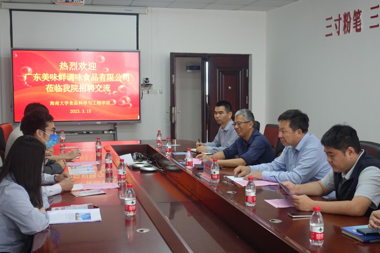 为进一步推进校企合作、深化产教融合、拓宽就业渠道,3月15日上午,曹宪忠副董事长出席好博体育与来访的广东美味鲜调味品有限公司“访企拓岗”座谈会。参加座谈会的有广东美味鲜调味品有限公司招聘经理司徒奕威、生产部门经理全斌、招聘专员张樱桃和欧阳天。公司邓秀成书记、张家超副经理、李川副经理、食品科学与工程系主任潘永贵教授、食品质量与安全系主任云永欢副教授参加座谈。座谈会由邓秀成书记主持。
