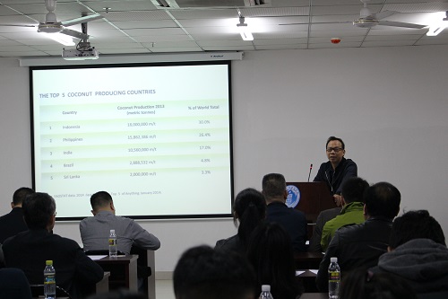 接着,由海口鲜美瑞实业有限公司总经理李枚秋老师发言,主题为国内外椰子加工现状与趋势。他介绍菲律宾,荷兰,斯里兰卡等国的椰子工业、椰子进口和出口,销售的比例及现状、中国和国外一些国家的椰子加工产品,加工设备。其阐述了椰子的发展,研究方向以及市场分析相关内容,并强调了国内众多椰子加工厂研究方向存在的显著问题。椰子作为海南特色水果,以及在国内外市场的极大需求的背景下,我们作为好博体育的一员,要充分发挥专业特长,积极的研究椰子,发挥叶子的营养价值,开发创新产品种类,推动其在市场上的流动。