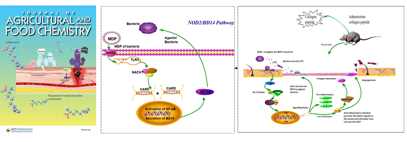 2020年1月,农林科学领域国际权威(Top,中科院1区)期刊《Journal of Agricultural and Food Chemistry》在线发表了申铉日、夏光华课题组题为“Collagen Peptides Isolated fromSalmo salarandTilapia niloticaSkin Accelerate Wound Healing by Altering Cutaneous Microbiome Colonization via Upregulated NOD2 and BD14”(https://pubs.acs.org/doi/10.1021/acs.jafc.9b08002)的封面文章,该论文是国家罗非鱼加工技术研发分中心和海南省南海水产资源高效利用工程研究中心的系列重要成果之一。