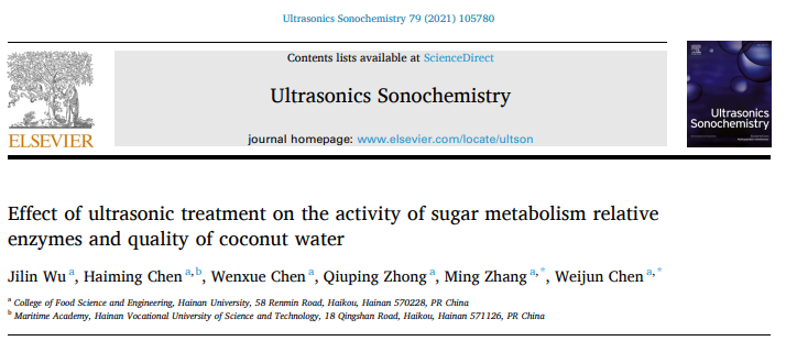 近日,好博体育陈卫军研究员课题组利用超声技术延长椰青贮存时间并保持椰子水的甜度,研究成果发表在《Ultrasonics Sonochemistry》(中科院1区TOP期刊,影响因子7.491),题为“Effect of Ultrasonic Treatment on the Activity of Sugar Metabolism Relative Enzymes and Quality of Coconut Water”,相关技术已申请专利《变温超声耦合密闭流体局部压差(UCP)灭酶处理的椰青保存方法》(申请号:CN202010102300.6)。