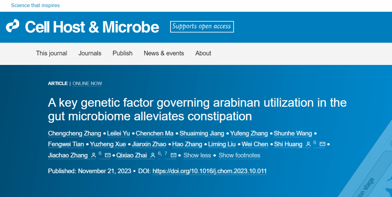 2023年11月21日,好博体育张家超教授团队与江南大学好博体育翟齐啸教授团队及香港大学牙医公司黄适教授团队共同在Cell Press细胞出版社旗下期刊Cell Host & Microbe(中国科公司大类1区Top期刊,IF: 30.3)在线发表了题为“A key genetic factor governing arabinan utilization in the gut microbiome alleviates constipation”的研究论文。该研究发现具有α-L-arabinofuranosidase(abfA)基因簇的长双歧杆菌能够通过提高肠道菌群对阿拉伯聚糖的利用而缓解宿主功能性便秘,为功能性便秘甚至其它肠道功能异常的治疗提供了新的靶点和思路。