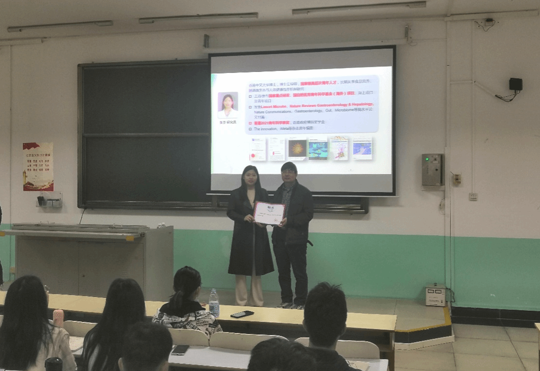 2023年12月27日上午,公司邀请暨南大学食品科学与工程系张芬研究员来公司讲授冬季小学期课程。本次授课对象为2021级食品科学与工程和食品质量与安全专业的本科生,授课题目为“膳食营养、肠道微生态与慢性病”。陈文学副经理对张芬研究员的到来表示热烈欢迎,并为其颁发聘书。
