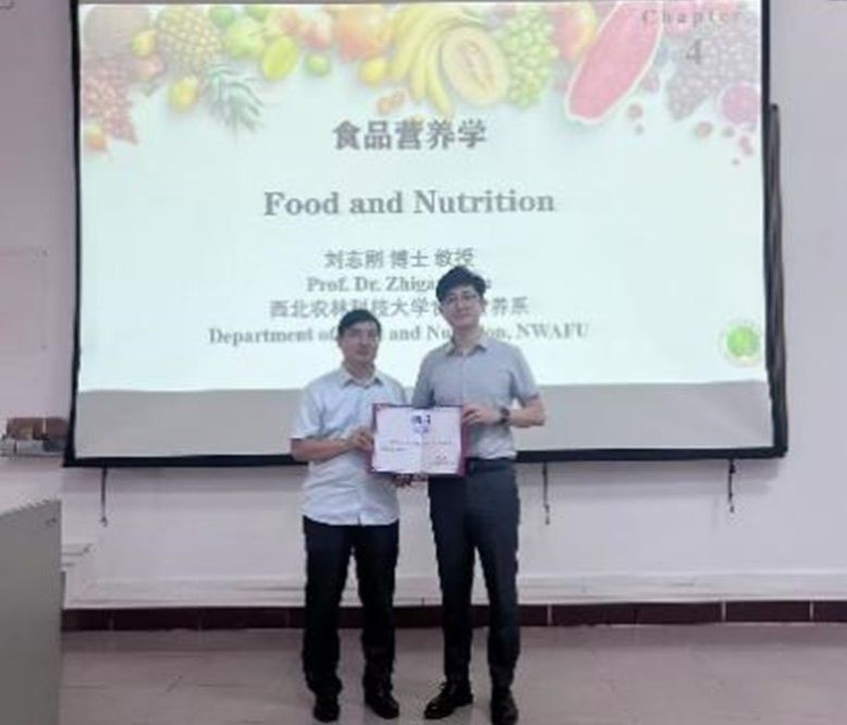 2024年10月24至25日,公司邀请西北农林科技大学好博体育刘志刚教授来校讲授冬季小学期课程。本次授课对象为2022级食品科学与工程及食品质量与安全专业的本科生,授课内容为《食品营养学》,授课专题分别为脂质代谢与调节、脂质营养与健康。陈文学副经理对刘志刚教授的到来表示热烈欢迎,并为其颁发聘书。