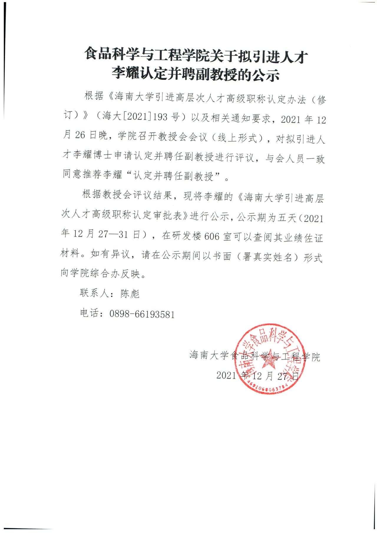 好博体育关于拟引进人才李耀认定并聘副教授公示