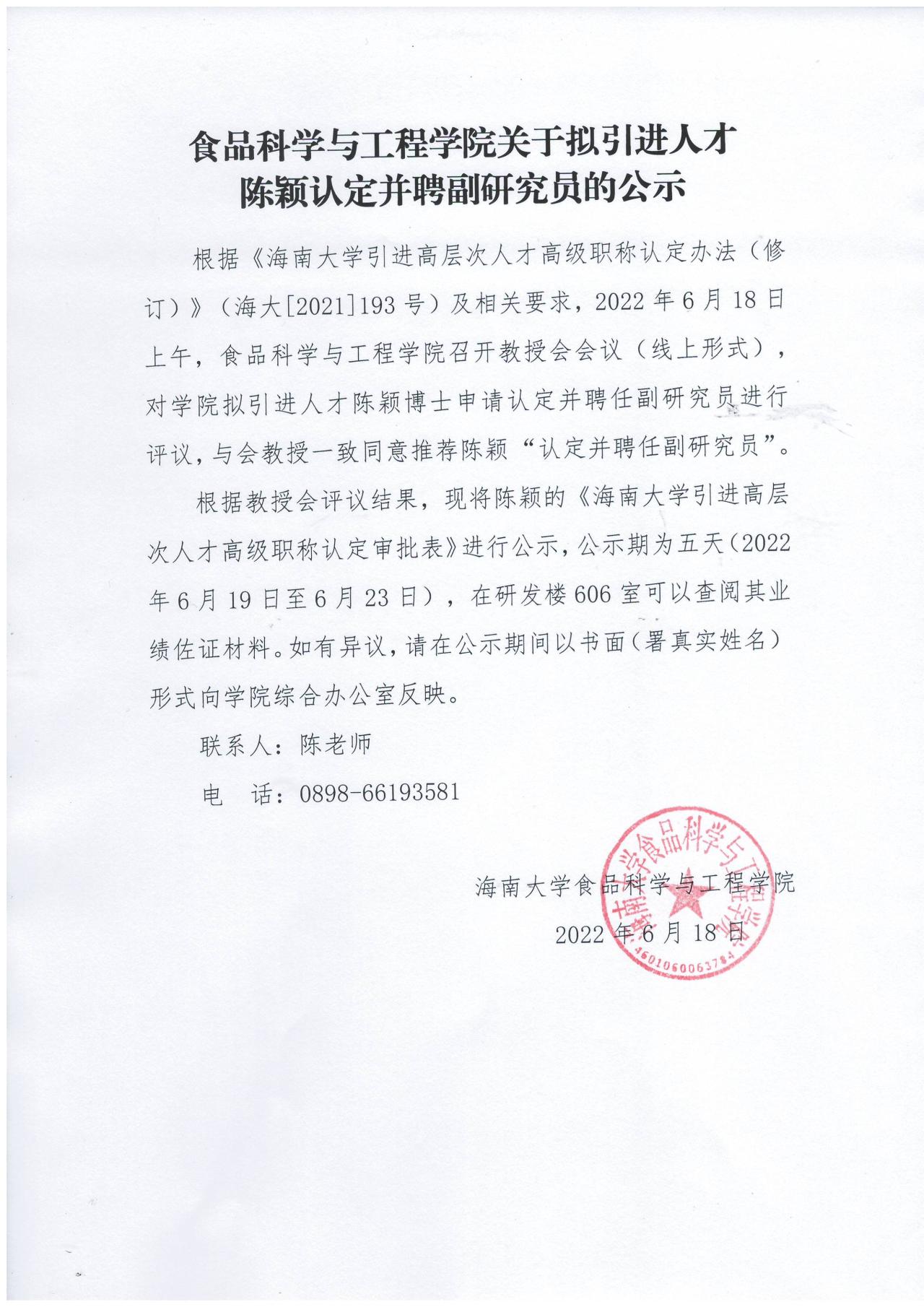 好博体育关于拟引进人才陈颖认定并聘副研究员的公示