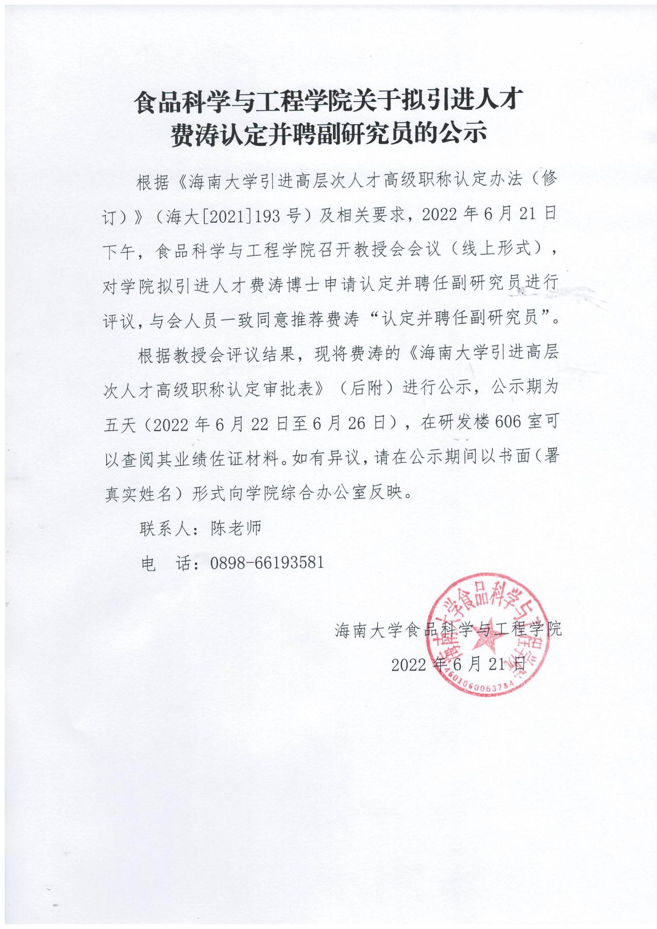 好博体育关于拟引进人才费涛认定并聘副研究员公示