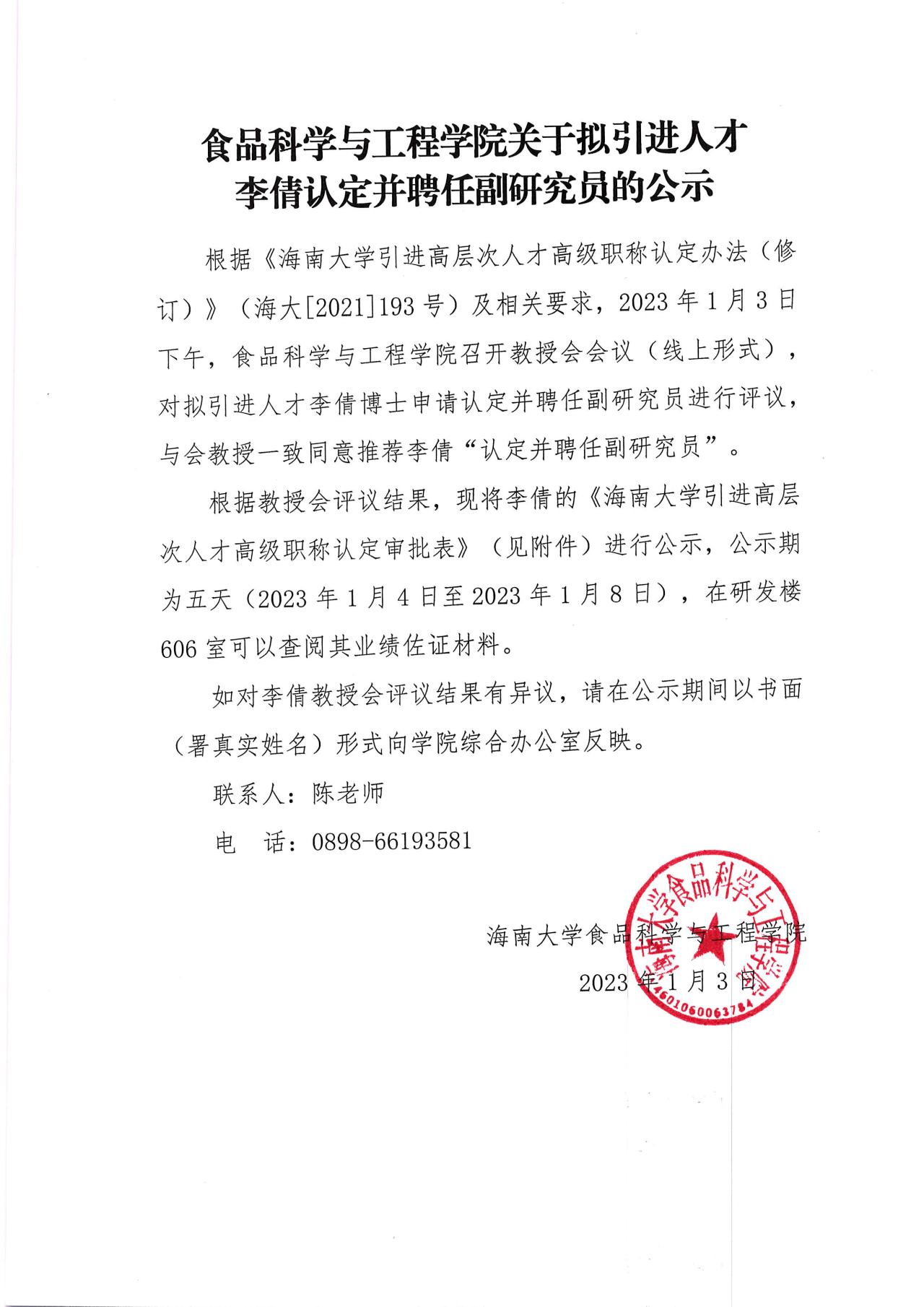 好博体育关于拟引进人才李倩认定并聘副研究员公示