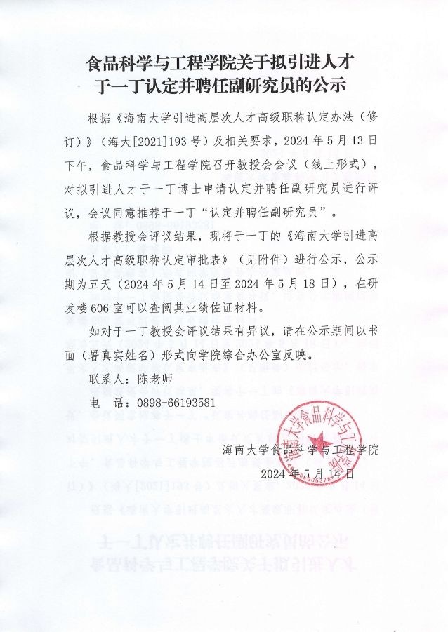 好博体育关于拟引进人才于一丁认定并聘任副研究员的公示